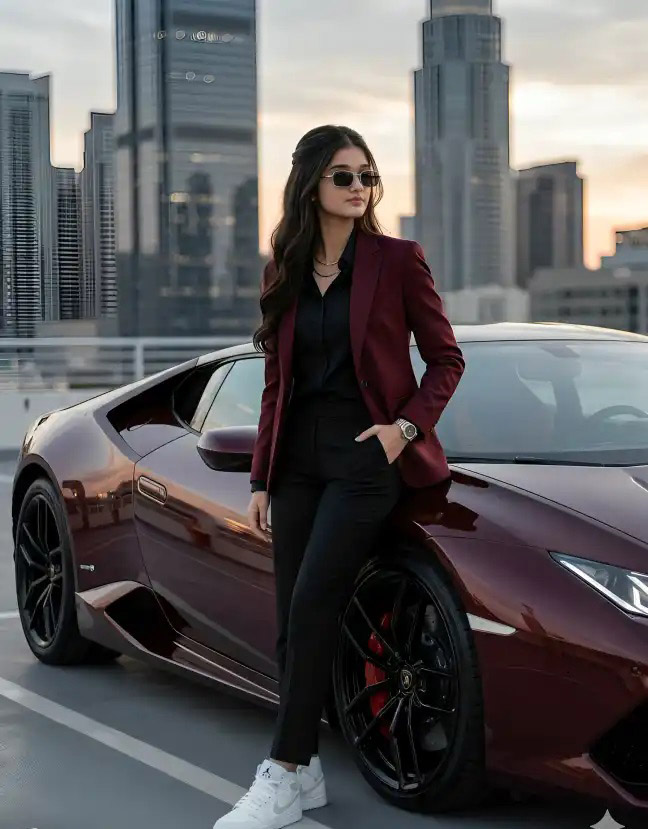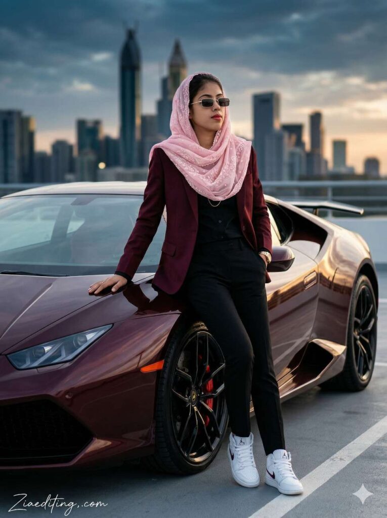 (Use uploaded reference face exactly, zero modification) FACE LOCK — ZERO MODIFICATION POLICY Face must remain 100% identical to the uploaded reference image. No reshaping, no beautification filters, no smoothing effects. Preserve natural facial identity including jawline, beard pattern, moustache shape, eyes, nose, lips and hairstyle exactly as the reference image. Ultra-HD crystal-clear facial detail required so the identity remains perfectly recognizable. ASPECT RATIO • 3:4 vertical STYLE Ultra-realistic luxury automotive editorial photography. High-fashion cinematic portrait style. 8K ultra-high resolution. SCENE DESCRIPTION Create a cinematic luxury portrait of a confident woman standing beside a dark maroon Lamborghini sports car in a modern rooftop parking area overlooking a city skyline. POSE The woman leans slightly against the side of the car with one hand resting on the hood while the other hand is placed inside her suit pocket. She looks toward the right side with a calm confident attitude. OUTFIT DETAILS Elegant deep maroon tailored suit jacket paired with a fitted black shirt and slim black trousers. ACCESSORIES Rectangle luxury sunglasses Minimal chain necklace Premium watch FOOTWEAR White Nike Air Jordan sneakers. CAR DETAILS Dark maroon Lamborghini featuring glossy paint reflections, black alloy rims and bright red brake calipers. BACKGROUND Cinematic rooftop city environment with blurred skyscrapers and dramatic evening sky. LIGHTING Soft cinematic sunset lighting mixed with city reflections creating luxury magazine-style highlights. CAMERA & STYLE Captured using professional 85mm DSLR portrait lens with ultra-sharp face focus and smooth depth of field. NEGATIVE PROMPT cartoon style, CGI character, blur, distorted anatomy, extra limbs, watermark artifacts. TEXT / SIGNATURE Add “Ziaediting,.com” at the bottom-left corner, HANDWRITTEN SIGNATURE-STYLE typography, thin cursive strokes, small size, subtle premium elegance, white or soft off-white color.
