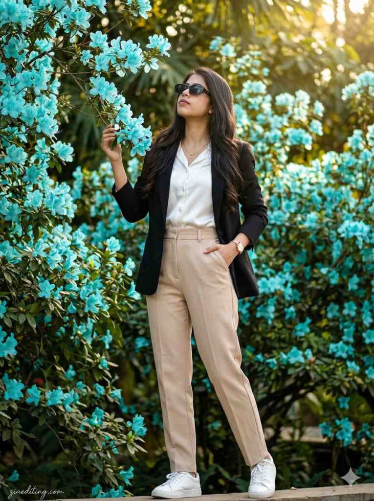 (Use uploaded reference face exactly, zero modification) FACE LOCK — ZERO MODIFICATION POLICY Face must remain 100% identical to the uploaded reference female image. No reshaping, no beautification filters, no smoothing effects. Preserve exact facial identity including jawline, cheeks, eyes, nose, lips and hairstyle exactly as the reference image. Ultra-HD crystal-clear facial details must remain perfectly recognizable. ASPECT RATIO • 3:4 vertical STYLE Ultra-realistic cinematic fashion portrait photography. Luxury outdoor editorial photoshoot aesthetic. 8K ultra-high resolution. SCENE DESCRIPTION Create a cinematic full-body portrait of a stylish Indian woman standing in a peaceful botanical garden filled with blooming aqua-blue flowers and soft greenery. POSE The woman stands confidently beside a flowering tree branch. One hand gently holds the branch while the other hand rests casually in her trouser pocket. Her body is slightly angled toward the camera while she looks calmly upward toward the blossoms. OUTFIT DETAILS Elegant black tailored blazer layered over a soft white silk blouse paired with high-waist beige tailored trousers. ACCESSORIES Sleek black sunglasses Minimal gold necklace Elegant wristwatch FOOTWEAR White premium fashion sneakers. HAIRSTYLE Long dark hair styled in smooth soft waves flowing naturally over the shoulders. BACKGROUND A dreamy botanical garden with aqua blue blossom trees, soft greenery and cinematic natural depth. LIGHTING Warm natural golden sunlight filtering through leaves creating soft highlights and gentle shadows. CAMERA & STYLE Captured with professional 85mm portrait lens. Ultra-sharp focus on the face with cinematic background depth blur. NEGATIVE PROMPT cartoon style, CGI character, blur, distorted anatomy, extra limbs, watermark artifacts. TEXT / SIGNATURE Add “Ziaediting.com” at the bottom-left corner, HANDWRITTEN SIGNATURE-STYLE typography, thin cursive strokes, small size, subtle premium elegance, white or soft off-white color.